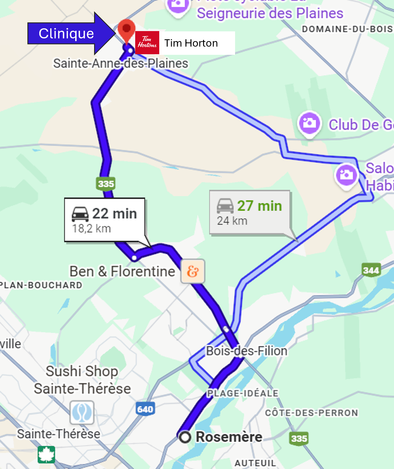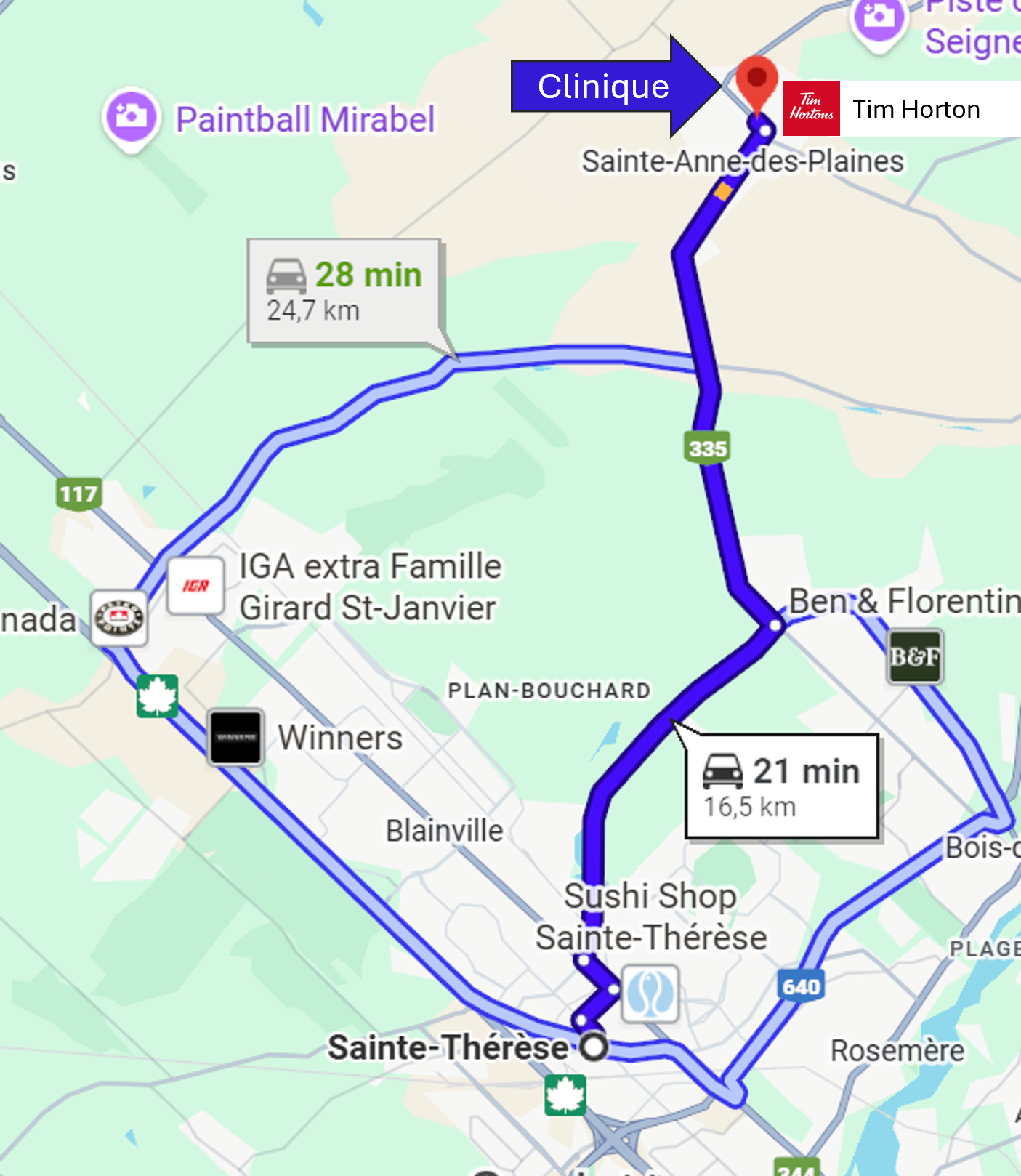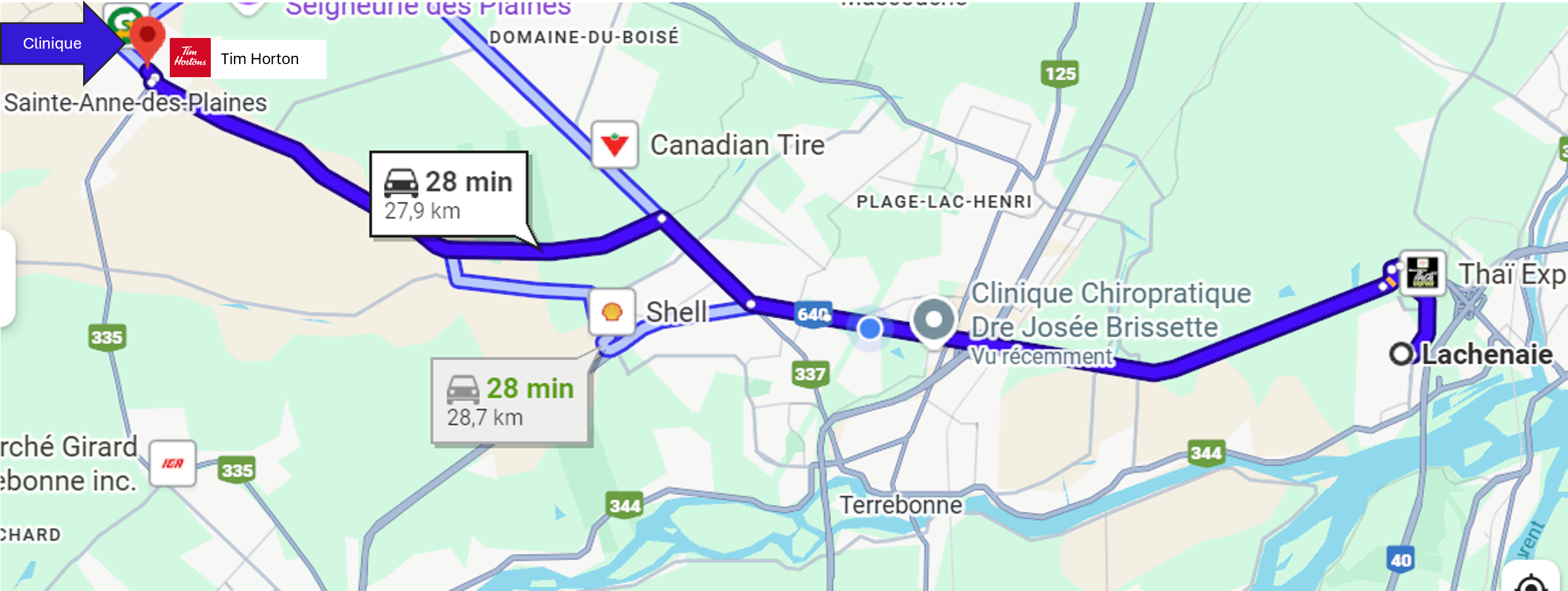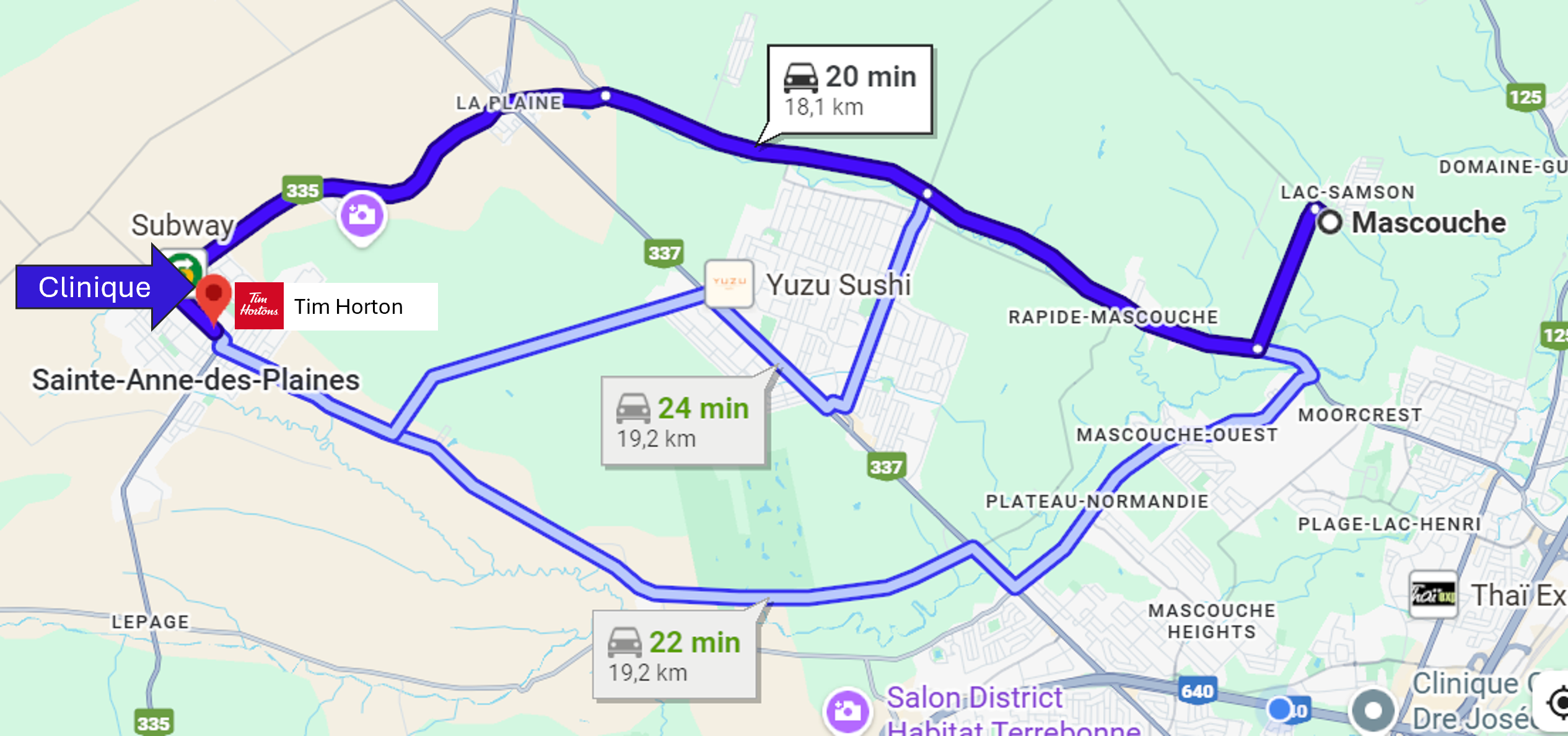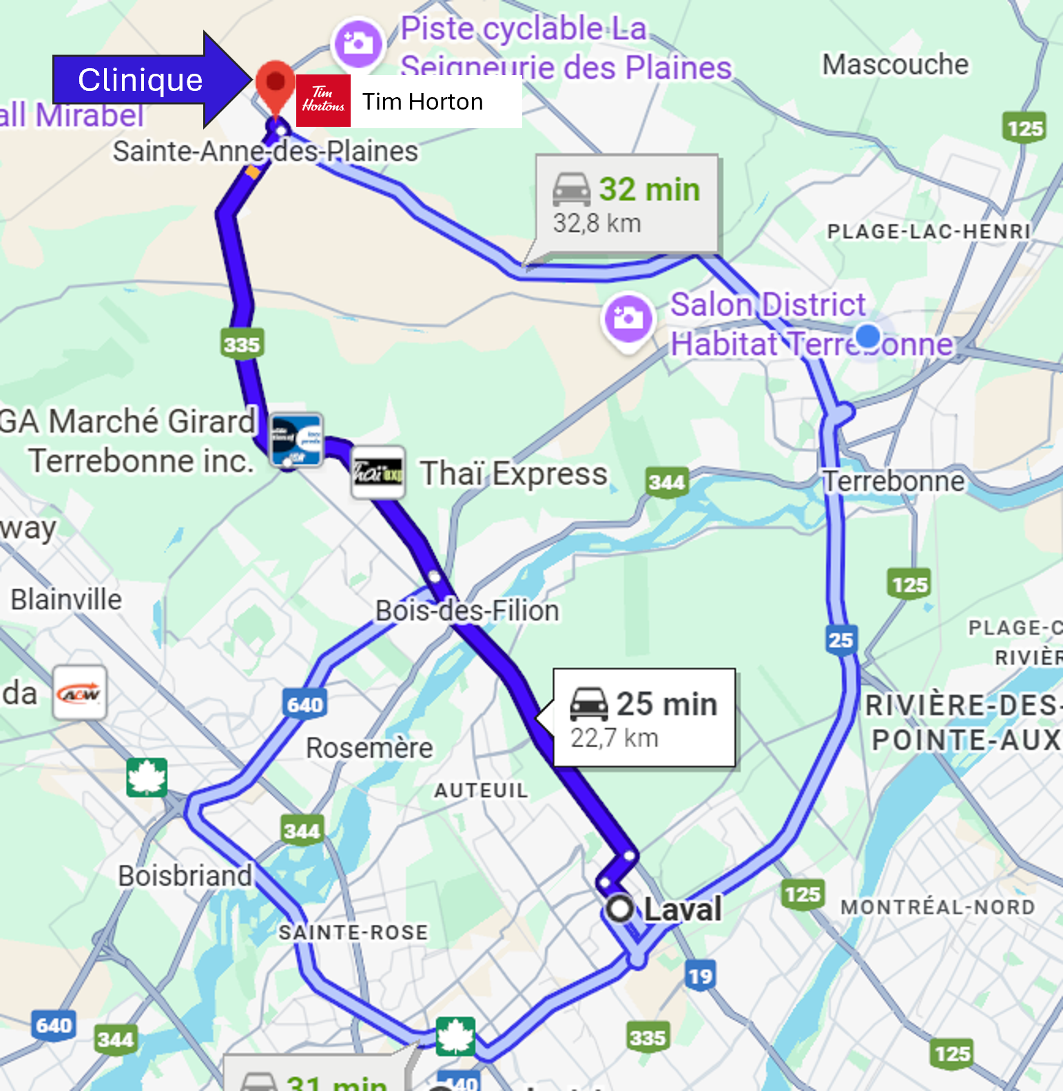 La clinique chiropratique de Dre Nathalie Bessette accueille des patients provenant d'une vingtaine villes et municipalités de la Rive-Nord de Montréal, situées à moins de 30 minutes de route de Sainte-Anne-des-Plaines selon les conditions normales de circulation.